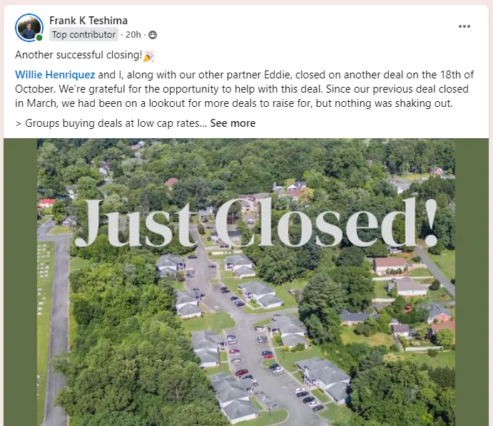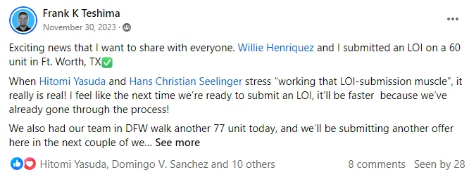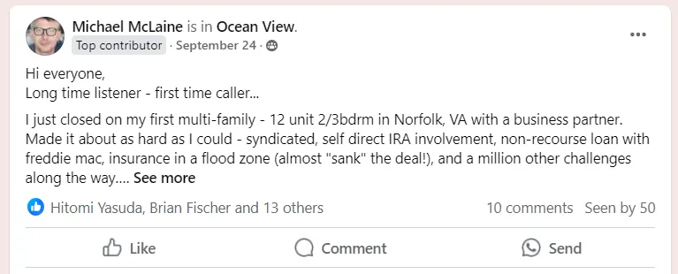 Over the past 6.5 years, she has partnered on multiple real estate ventures, underwriting more than 1,500 multifamily and commercial syndication deals across 10+ states.