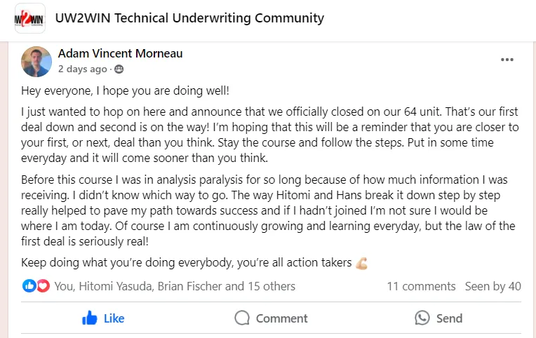 As co-founder of UW2WIN Technical Underwriting Coaching Program, Hans has trained and mentored hundreds of investors to become Bad A$$ multifamily investors, confidently underwrite deals and close on their 1st multifamily. His hands-on guidance has helped clients bridge the gap from analysis to action—to financial freedom